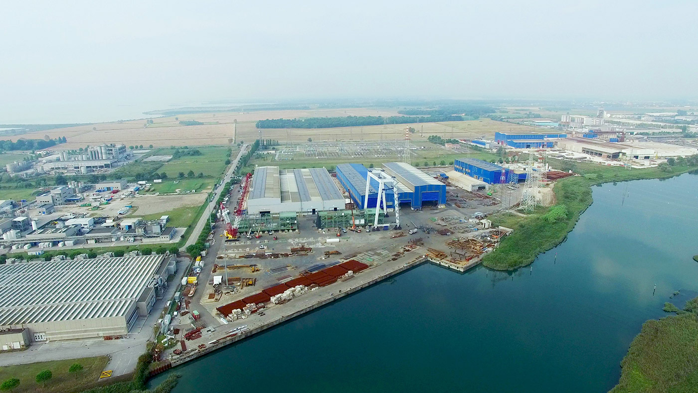 The Cimolai pipe mill in San Giorgio di Nogaro (UD), with access to the Adriatic Sea, covers 180,000 sqm (60,000 covered) and features a 200 m private quay with a 7 m draft. The equipment handles components of all sizes: 350 t overhead crane, SPMTs, telescopic/crawler cranes, strand jacks, and lifting towers.