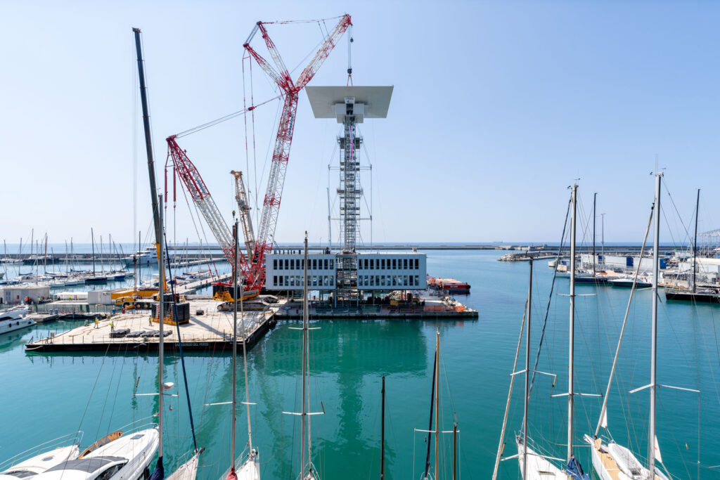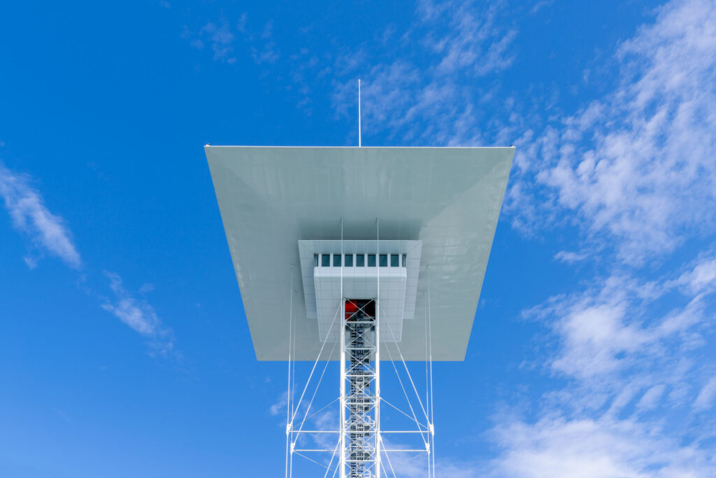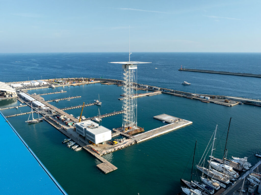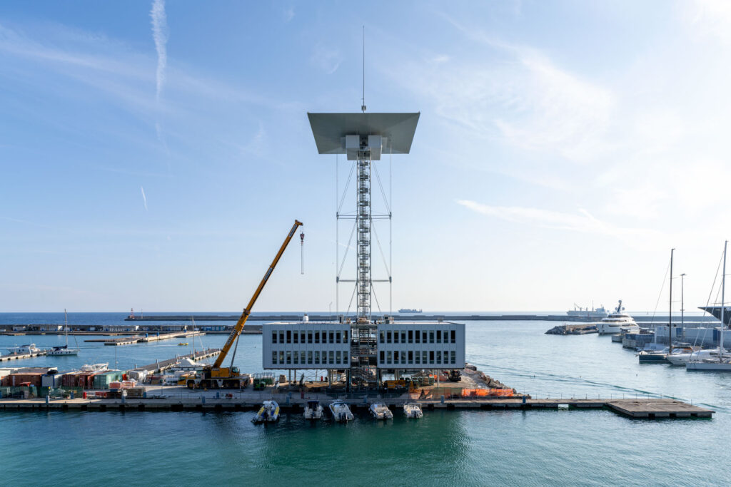 Descrizione: struttura metallica leggera fatta di tubi e tiranti che evoca le architetture delle vecchie gru delle banchine portuali. In sommità alla torre alta 65 m è collocata la cabina dei piloti che, dotata di ampie finestrature, permetterà di controllare a vista l’ingresso del porto. Al di sopra, la copertura quadrata di lato 28 m fa da grande visiera protettiva. Fanno parte del progetto anche l’edificio di due piani e la passerella a servizio della torre.